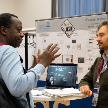 Am Nachmittag präsentierten sich beim „Innovation & Information Hub“ weitere spannende Projekte von studiumdigitale und anderen Einrichtungen der Goethe-Universität und luden zum Netzwerken ein: an unseren Ständen konnte man sich unter anderem zu moodle und zu Barrierefreiheit in digitalen Kontexten informieren. Das Projekt DALE (Digitalisierung und aktivierendes Lernen) zeigte an sechs Ständen innovative digitale Lernszenarien aus verschiedenen Fachbereichen. Das HRZ war ebenfalls vertreten mit Ständen zur OLAT und der Medientechnik. Außerdem stellten sich die Tutor*innenqualifizierung, das interdisziplinäre Kolleg Hochschuldidaktik, das Schreibzentrum und die Schlüsselkompetenzen an ihren Ständen vor. Hinzukamen weitere digitale Lehrprojekte. Ein Überblick über die vielen weiteren Projekte ist auf der Programmseite zu finden.
