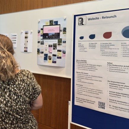 Auch die Webstrategie der Universität war Thema: Die Teilnehmenden erhielten erste Einblicke in das neue Design und die verbesserte Nutzerführung des geplanten Web-Relaunchs. Außerdem konnten sie das neue Content-Management-System Magnolia direkt ausprobieren und dem Webteam Fragen zum neuen Außenauftritt stellen.