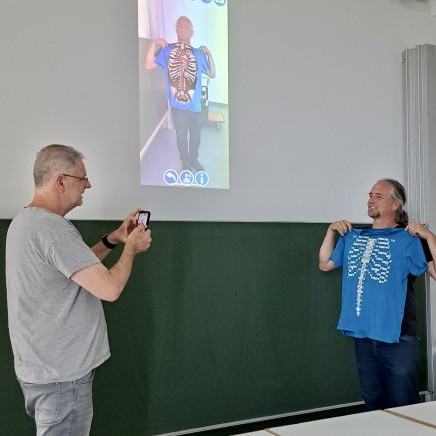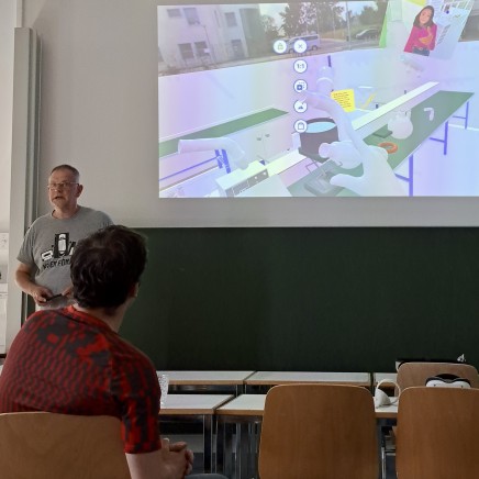 Im Vortrag wurden verschiedene technische Lösungen präsentiert. Von einfachen VR-Brillen aus Karton über die High-End-Versionen aus dem Hause Apple und Meta bis hin zur eleganten X-Real Sonnenbrille stellte uns Prof. Schindler verschiedene Modelle vor. Die Entwicklung der VR-Brillen schreitet rasant voran, was auch zu einer Diskussion über die potenziellen Auswirkungen auf zukünftige Lernformate führte.