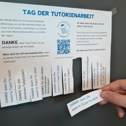 Wir begleiten die Aktion auf unserem Instagram-Kanal, @tutorinnenqualifi_goetheuni. Machen Sie ein Foto vom Kompliment, das Sie überreichen, posten Sie es auf Instagram mit #tagdertutorienarbeit und taggen Sie unseren Account. Dann teilen wir es in unserer Story!